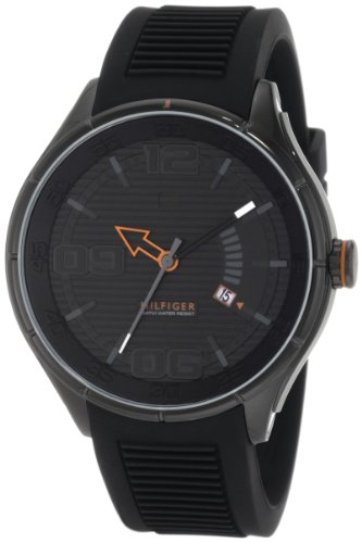This Tommy Hilfiger Sport inspired watch is easy to wear day or night. The Black IP Plated Stainless Steel case features a Black textured dial with black bezel and Black Arabic Numerals at the 12, 6, and 9 o'clock and a date window at 3 o'clock. The hour hand features an orange arrow while the minute and second hands keep tonal black with white tips. The black silicone strap features a smooth feel with a unique texture that makes it look both classic and sporty with a buckle closure. Water Resistant up to 165 feet with a limited 10 year warranty.